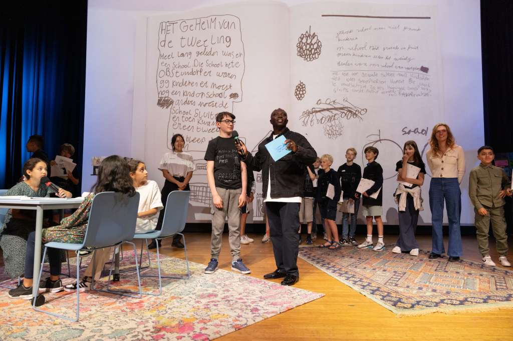 Waar schrijven kinderen over? Wineke: “Het ene kind laat veel makkelijker iets persoonlijks zien dan een ander natuurlijk. En het hangt ook van de leeftijd af. Schrijfster Najiba Abdellaoui deed mee aan de workshop die heette ‘Meerstemmig en meertalig’. Dat hebben we in groep 8 gedaan. En die kinderen zijn al wat bewuster over zichzelf en over wat er in de wereld gebeurt. Die kijken ook anders. Zij heeft kinderen laten schrijven over hun dromen en verlangens. Uiteindelijk hebben ze daar allemaal een liedtekst of een rap over gemaakt. Die hebben ze gezongen of gerapt met muziek eronder. Die teksten gaan absoluut over hun eigen binnenwereld. Maar ze zijn ook heel erg begaan met andere kinderen in Gaza, waarover één van de jongens een hartverscheurend lied had gemaakt. En kinderen schrijven natuurlijk vaak over alledaagse dingen, over voetbal en thuis bijvoorbeeld.
